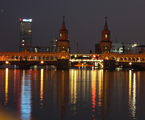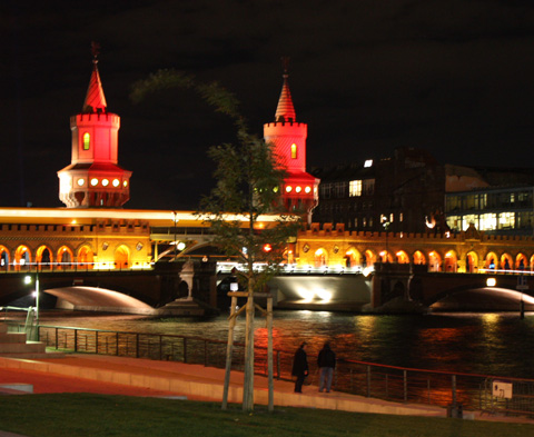für mich die schönste Brücke Berlins. Manchmal erstrahlt sie in hellem Licht, manchmal, im Oktober ist sie illuminiert, meist jedoch recht dunkel. Berlin hat eben kein Geld. Unter die Brücke führen die bekanntesten Schifffahrten hindurch, die nach Treptow oder nach Kreuzberg in den Landwehrkanal wollen. An zwei Wochenenden im Juni und August ist die Brücke für den Verkehr komplett gesperrt zur Open Air Galerie.